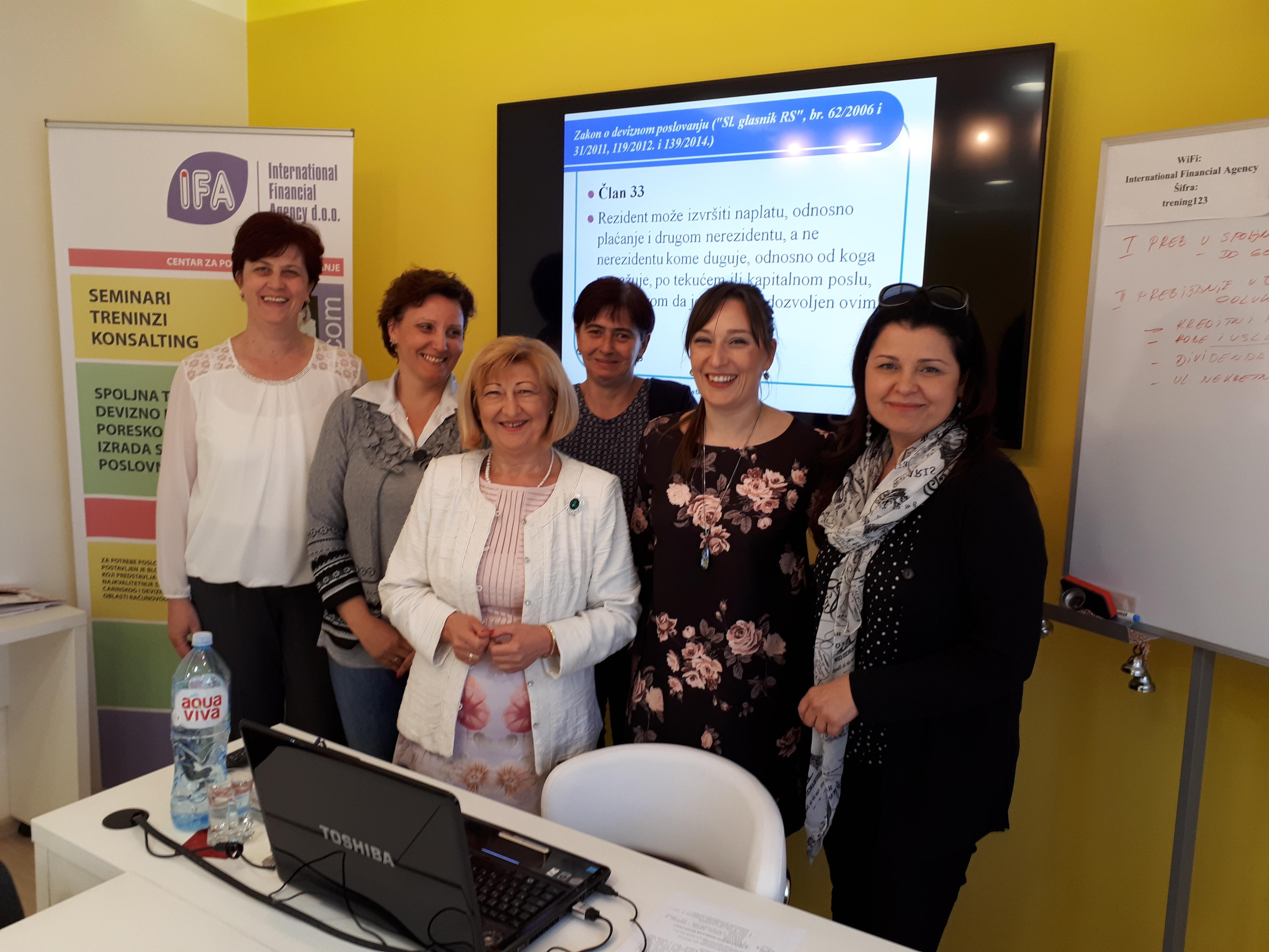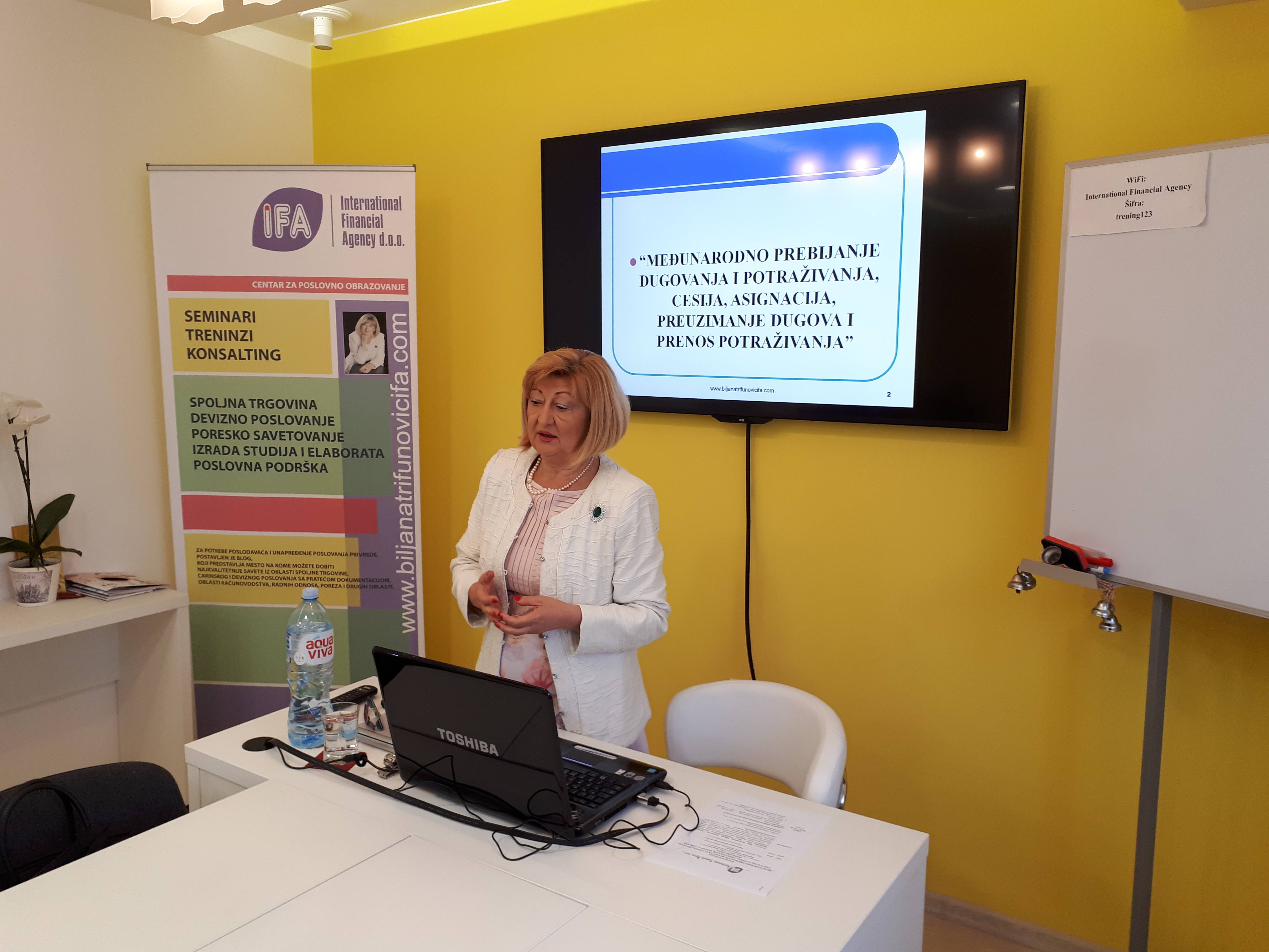 U organizaciji Centra za poslovnu edukaciju Preduzeća „IFA – INTERNATIONAL FINANCIAL AGENCY“ d.o.o., u poslovnim prostorijama Preduzeća IFA u Beogradu, u ulici Đorđa Nešića br. 2., održan je seminar “MEĐUNARODNO PREBIJANJE DUGOVANJA I POTRAŽIVANJA, CESIJA I ASIGNACIJA U SPOLJNOJ TRGOVINI“ dana 17. 05. 2018.